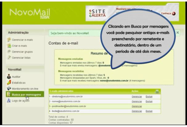 O NovoMail é uma ferramenta completa para deixar o e-mail da sua empresa ou negócio ainda mais profissional, oferecendo de maneira simples busca de mensagens, histórico de procedimentos, relatórios e gráficos de mensagens enviadas, recebidas e rejeitadas, auditoria e monitoramento de contas de correio eletrônico, dentre outros recursos.