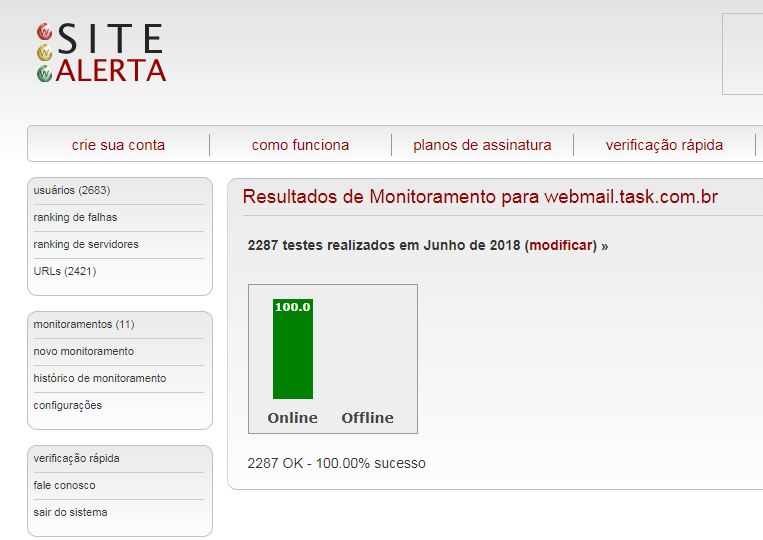 O SiteAlerta é um sistema de monitoramento de sites que verifica se o seu site ou serviço web está no ar, enviando e-mail para alertá-lo em caso de falha ou de retorno do serviço e gerando relatórios de desempenho. O SiteAlerta monitora o seu site 24 horas por dia, 7 dias por semana, 365 dias por ano.